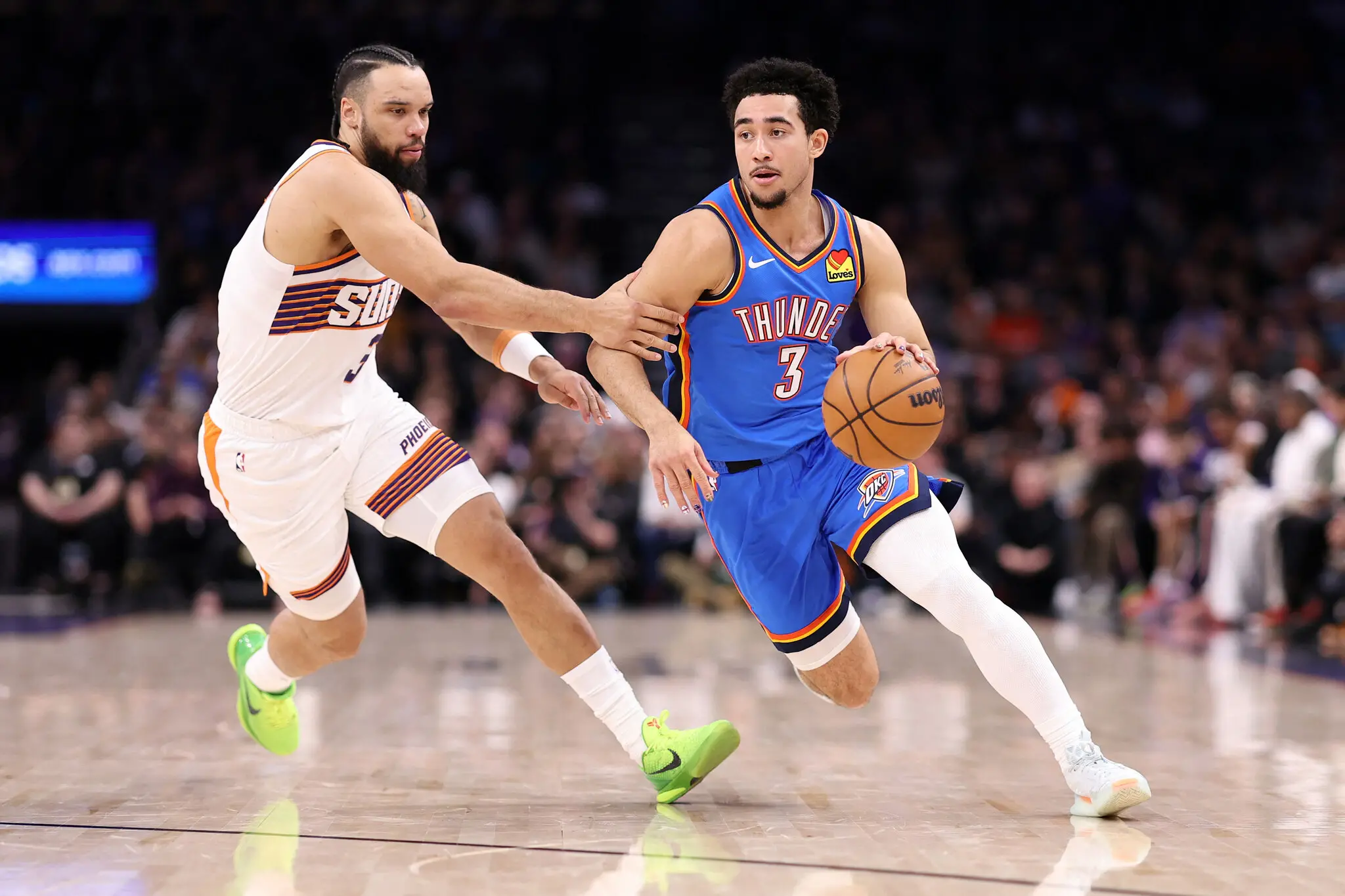 Dillon Brooks, do Phoenix Suns, e Jared McCain, do Oklahoma City Thunder, durante jogo da NBA