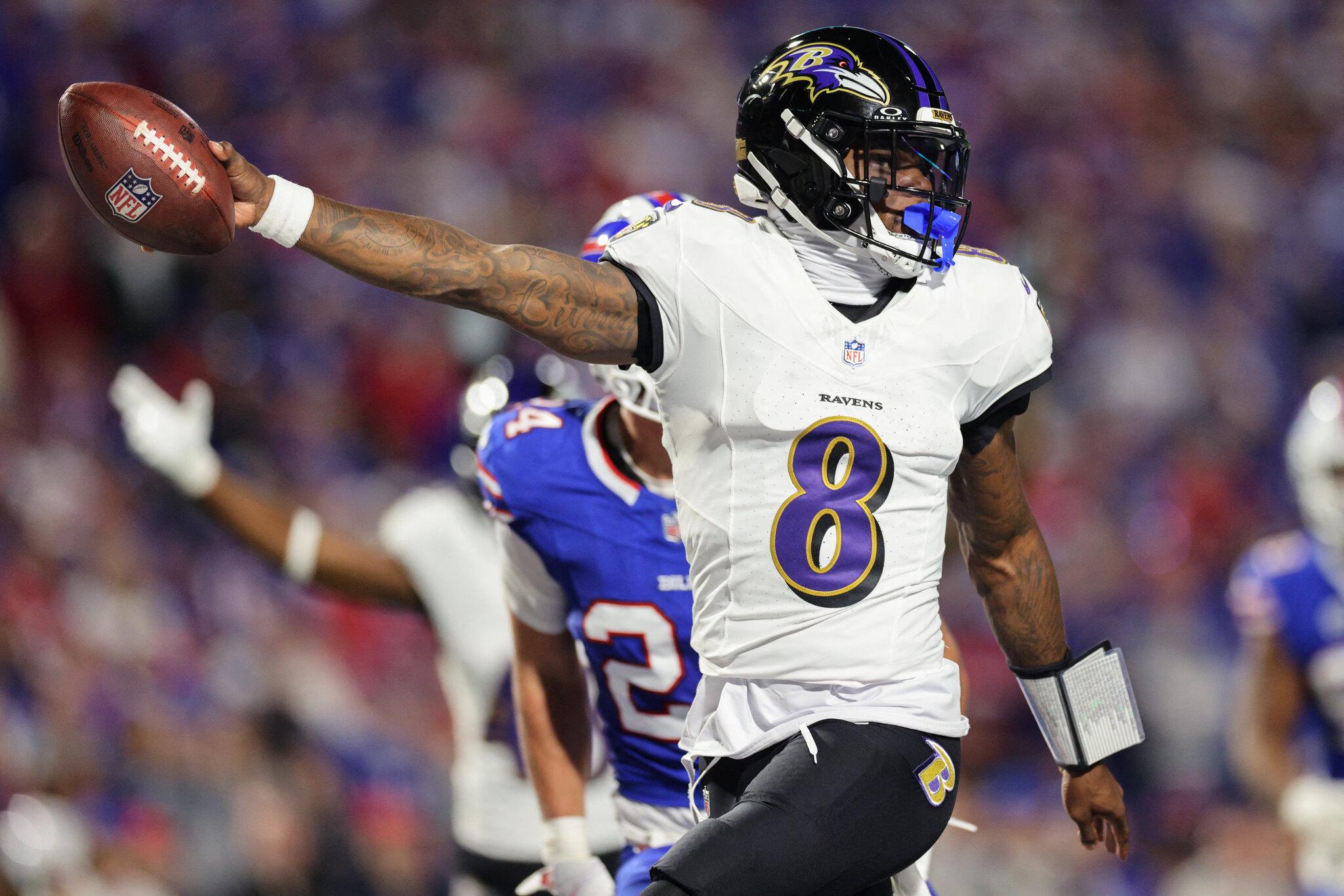 Lamar Jackson, jogador do Baltimore Ravens, durante jogo na NFL
