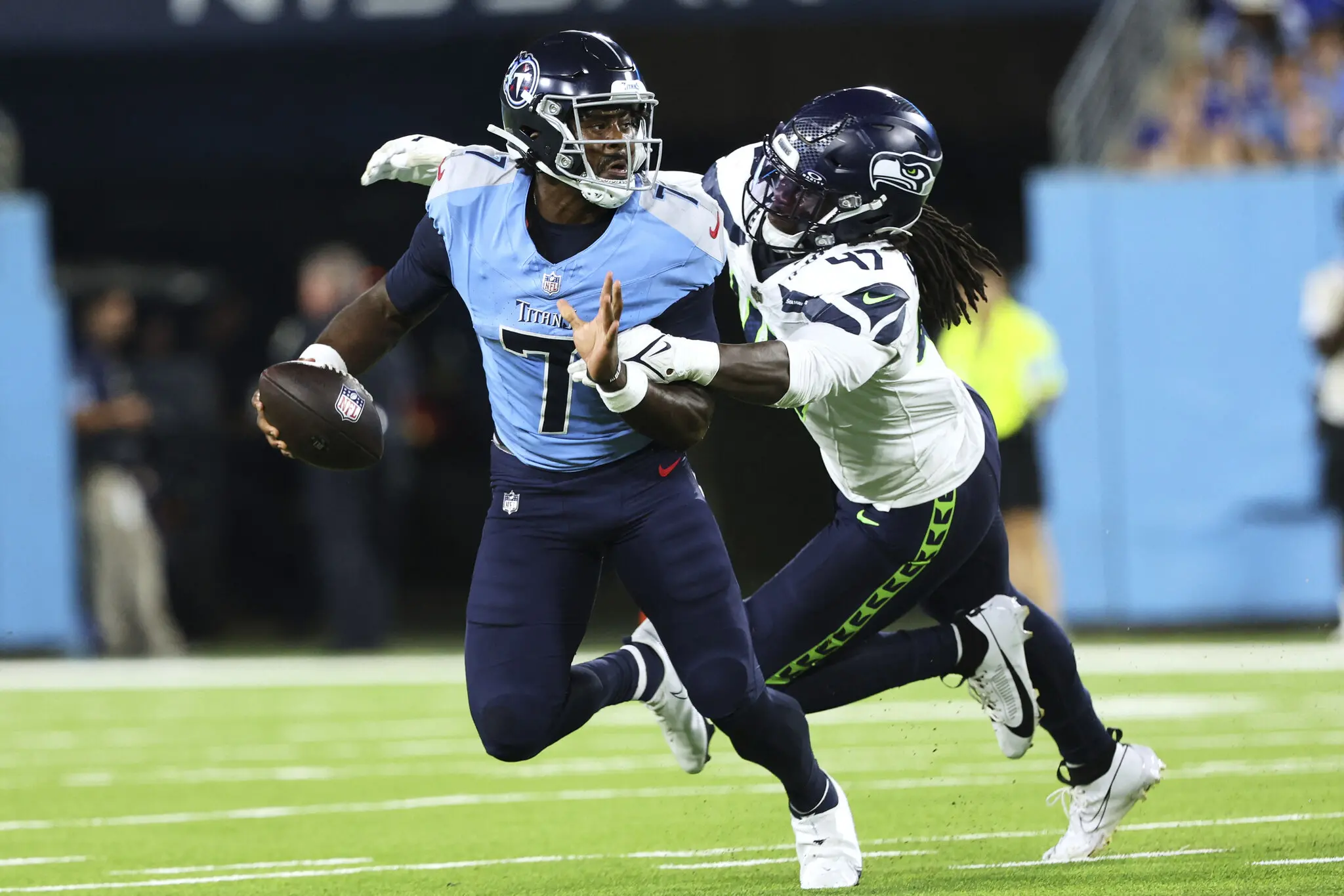 Malik Willis, jogador do Tennessee Titans, durante jogo contra o Seattle Seahawks, pela pré-temporada da NFL 2024/25
