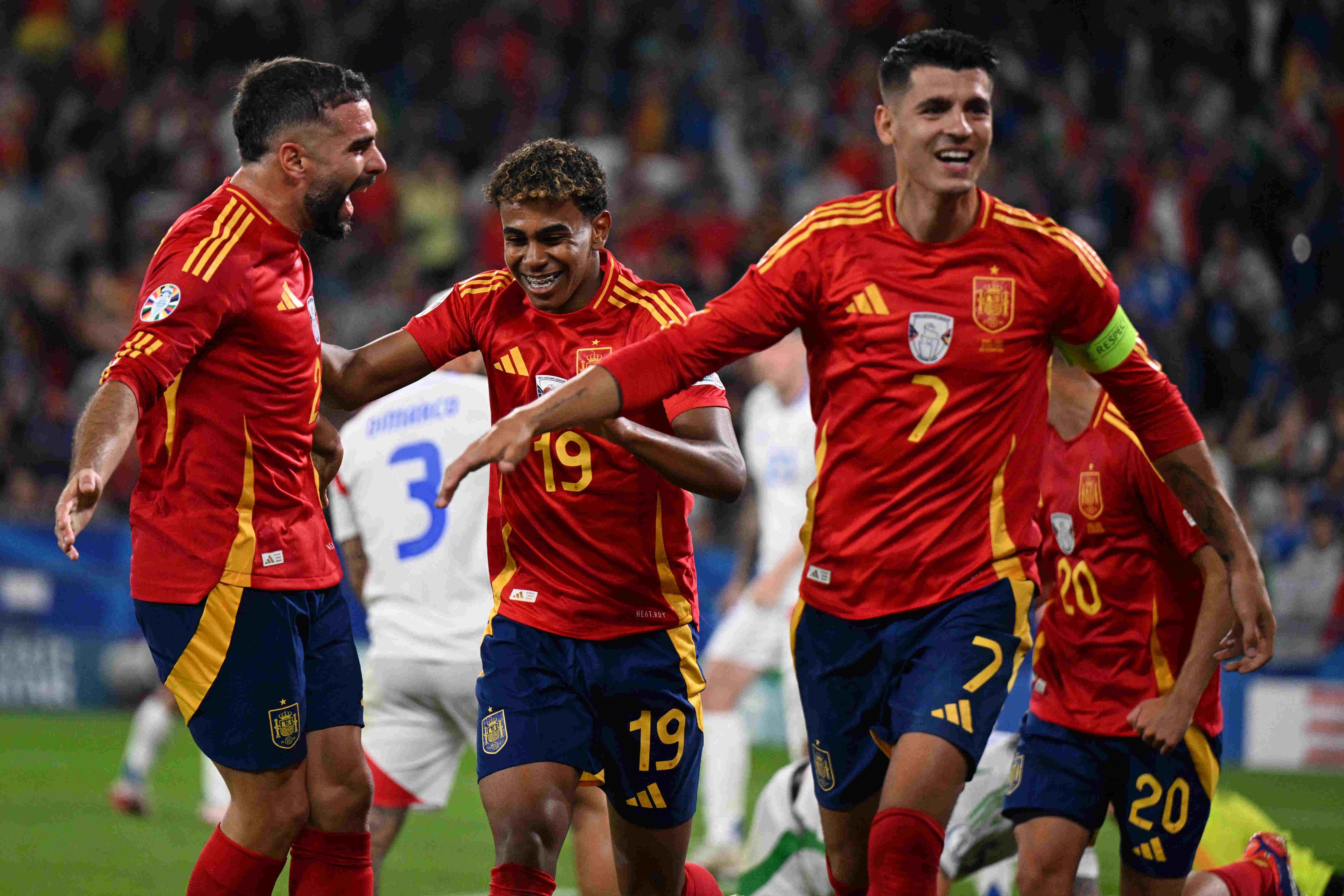 Jogadores da seleção da Espanha comemoram gol