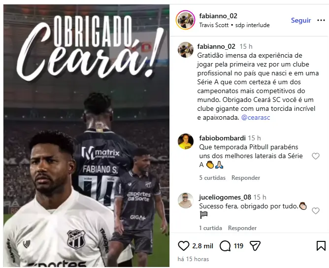 Em sua rede social, Fabiano publicou um video com seus lances de jogo no Ceará e uma nota lembrando que o Ceará foi seu 1º clube no país, já que fez carreira profissional em Portugal e atuou apenas na base da Penapolense/SP.