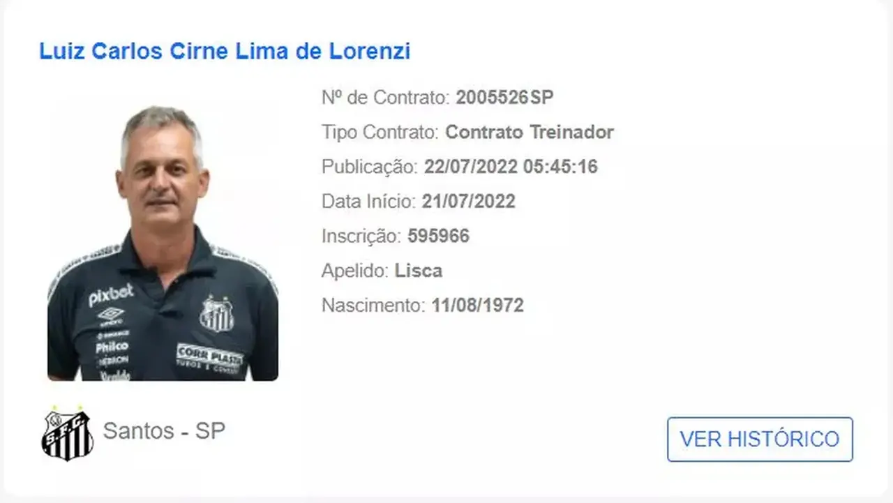O técnico Lisca estreará pelo Santos diante do Fortaleza, pela 19ª rodada da Série A do Campeonato Brasileiro. O treinador foi registrado no fim da tarde desta sexta-feira no BID (Boletim Informativo Diário) da CBF e fará sua estreia pelo Alvinegro praiano, neste domingo, às 19h, na Arena Castelão, contra o Tricolor de Aço.