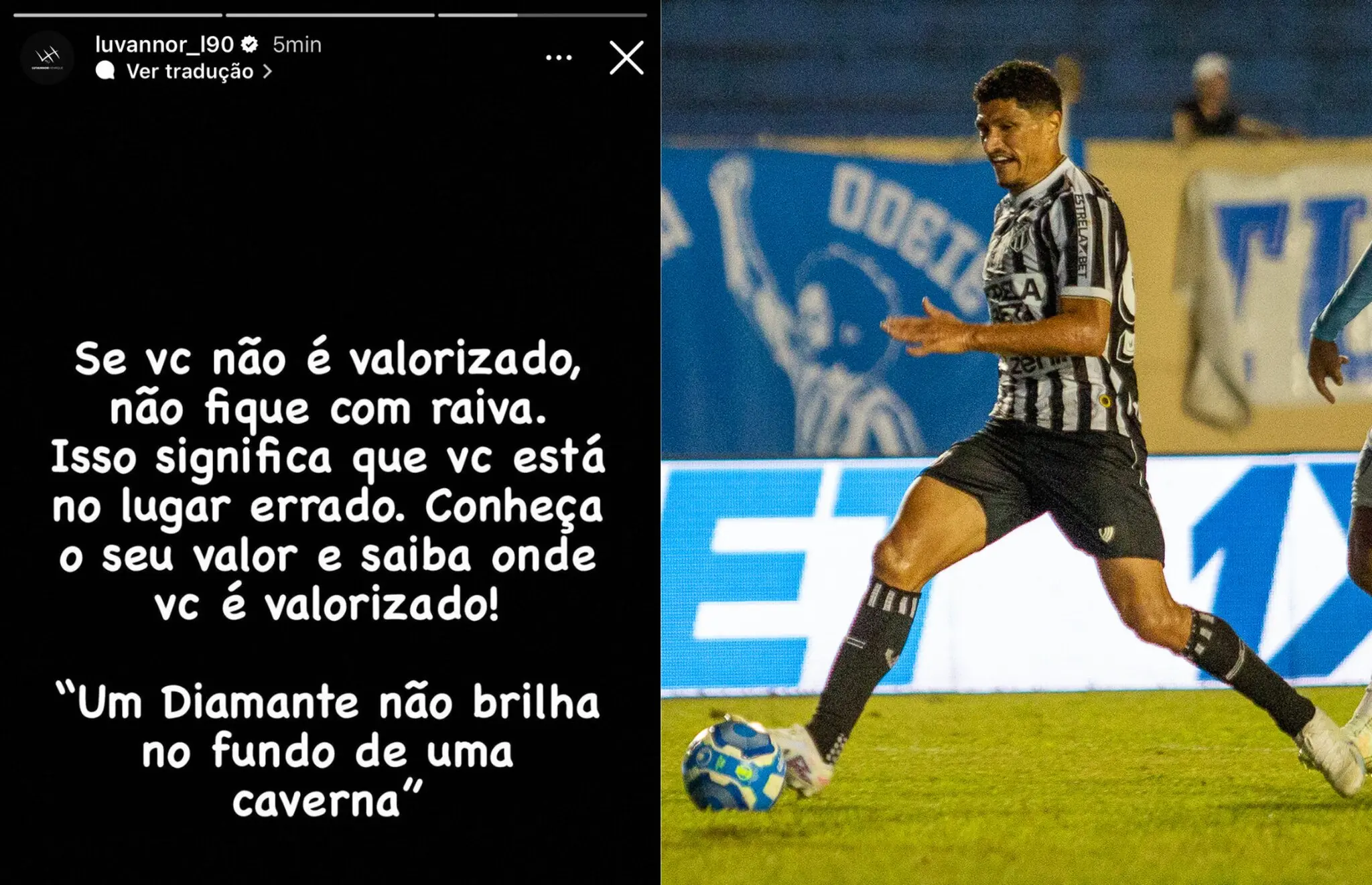 "Se você não é valorizado, não fique com raiva. Isso significa que vc está no lugar errado. Conheça o seu valor e saiba onde vc é valorizado!", escreveu o jogador. Luvannor ainda chegou a colocar na publicação uma citação, "Um diamante não brilha no fundo de uma caverna", encerrou.