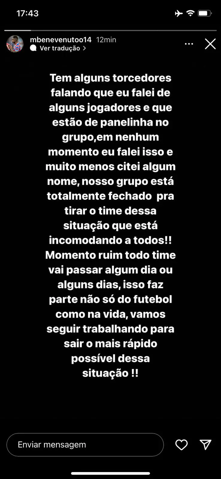 Tem alguns torcedores falando que eu falei de alguns jogadores e que estão de panelinha no grupo. Em nenhum momento eu falei isso e muito menos citei algum nome, nosso grupo está totalmente fechado para tirar o time dessa situação que está incomodando a todos! Momento ruim todo time vai passar algum dia ou alguns dias, faz parte não só do futebol como na vida. Vamos seguir trabalhando para sair o mais rápido possível dessa situação”, escreveu o zagueiro na postagem.