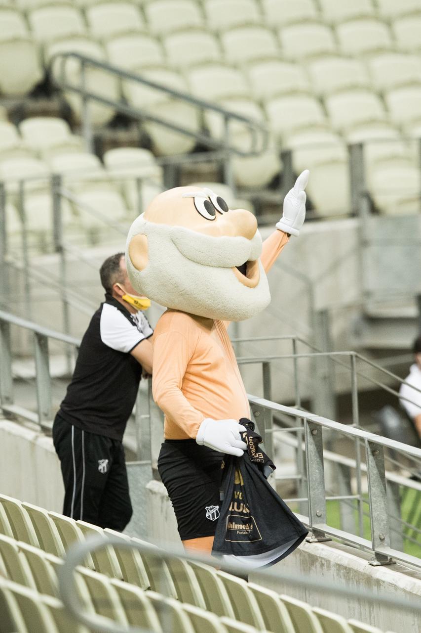 Representante solitário da torcida do Ceará nos jogos, o mascote Vozão tirou a camisa durante a comemoração da vitória por 2 a 0 no Clássico-Rei neste domingo (20).