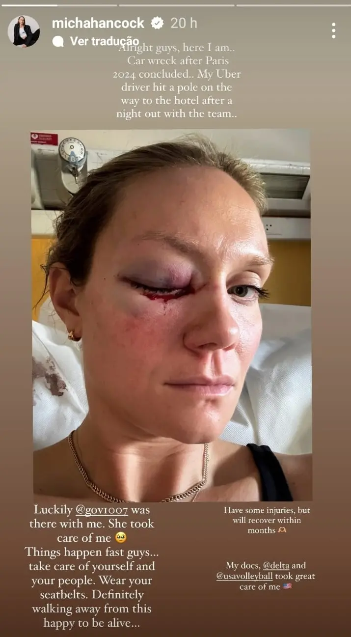 "Certo, pessoal, aqui estou. Acidente de carro após a conclusão de Paris-2024. Meu motorista do Uber bateu em um poste quando estávamos a caminho do hotel depois de uma noite de comemoração da equipe. Ainda bem que a Larson estava lá. Ela cuidou de mim. As coisas acontecem rápido. Cuidem de vocês e de seus familiares Utilizem cinto de segurança. Definitivamente, saio dessa feliz por estar viva. Sofri algumas lesões, mas me recuperarei delas em meses. Meu médicos estão cuidando de mim", escreveu Hancock, que postou uma foto com os olhos inchados e roxos.