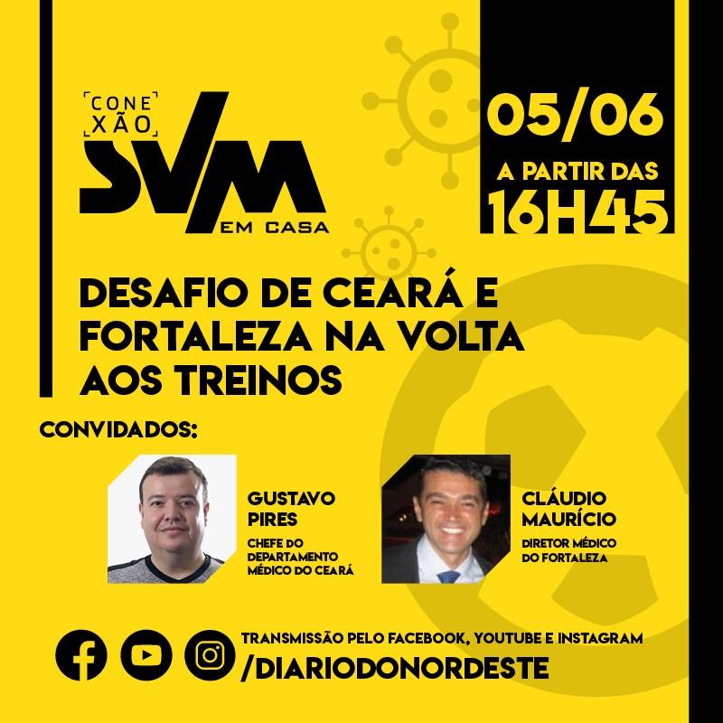 Na primeira semana de volta aos treinos, Ceará e Fortaleza enfrentam grandes desafios para executar as atividades em plena segurança. O Conexão SVM em casa de hoje traz os chefes dos departamentos médicos dos dois clubes, que falam sobre os testes realizados, a dinâmica das atividades e a expectativa do retorno dos jogos.