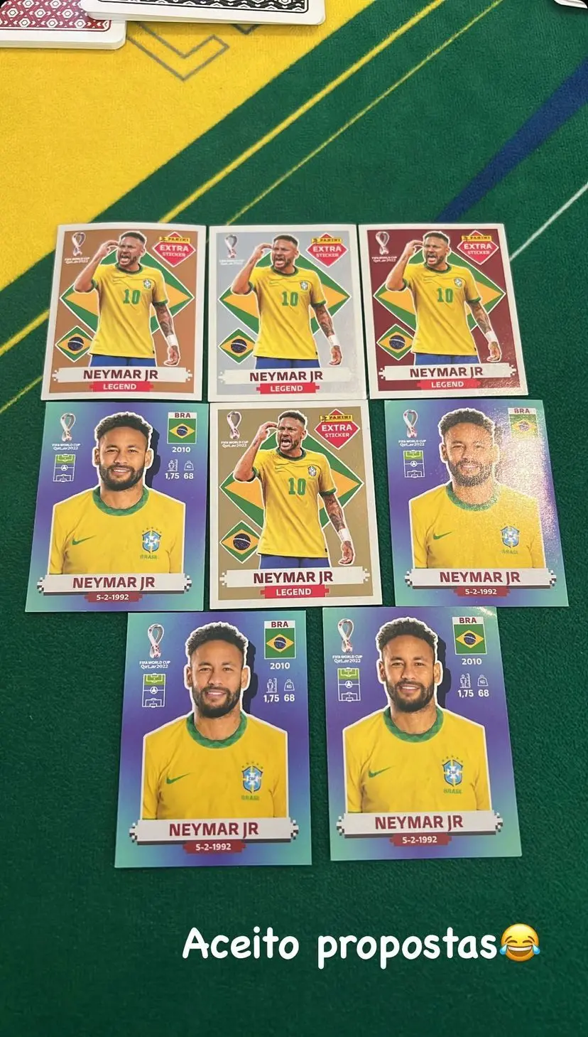 Astro do Paris Saint-Germain, o atacante Neymar Júnior entrou na onda do álbum da Copa do Mundo e das figurinhas lendárias. Em postagem nas redes sociais, o brasileiro exibiu a coleção de colecionáveis 'legends' e brincou dizendo que aceita propostas, fazendo referência aos valores pagos pelo objeto, podendo chegar até R$ 9 mil.