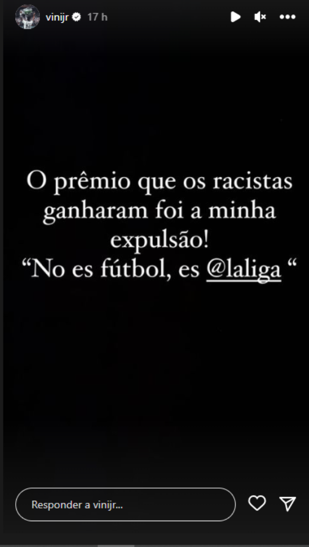 "Não foi a primeira vez, nem a segunda e nem a terceira. O racismo é o normal na La Liga. A competição acha normal, a Federação também e os adversários incentivam. Lamento muito. O campeonato que já foi de Ronaldinho, Ronaldo, Cristiano e Messi, hoje é dos racistas. Uma nação linda, que me acolheu e que amo, mas que aceitou exportar a imagem para o mundo de um país racista. Lamento pelos espanhois que não concordam, mas hoje, no Brasil, a Espanha é conhecida como um país de racistas. E, infelizmente, por tudo o que acontece a cada semana, não tenho como defender. Eu concordo. Mas eu sou forte e vou até o fim contra os racistas. Mesmo que longe daqui. 🖤✊🏿", escreveu o brasileiro.