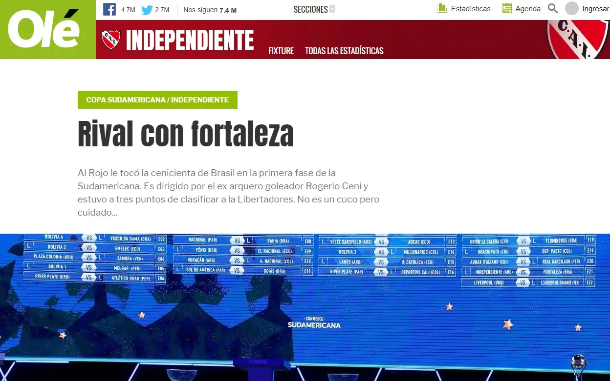 "Provavelmente, no norte brasileiro, eles levaram às mãos à cabeça, sabendo que o sorteio não os favoreceu. No entanto, no Rojo, eles sabem que o adversário da estreia na Sul-Americana 2020 é, no mínimo, para se ter cuidado. Independiente, que já foi campeão duas vezes da competição, deverá viajar os quase 4.000 km que os separam da casa da Cinderela do Brasileirão para se definir a primeira chave de uma Copa que, apesar de ostentar em suas vitrines, ficou engasgada pela última edição, em que a equipe dirigida neste momento por Beccacece foi eliminada nas semis pelo Independiente del Valle", diz, outro trecho, em tradução livre.
