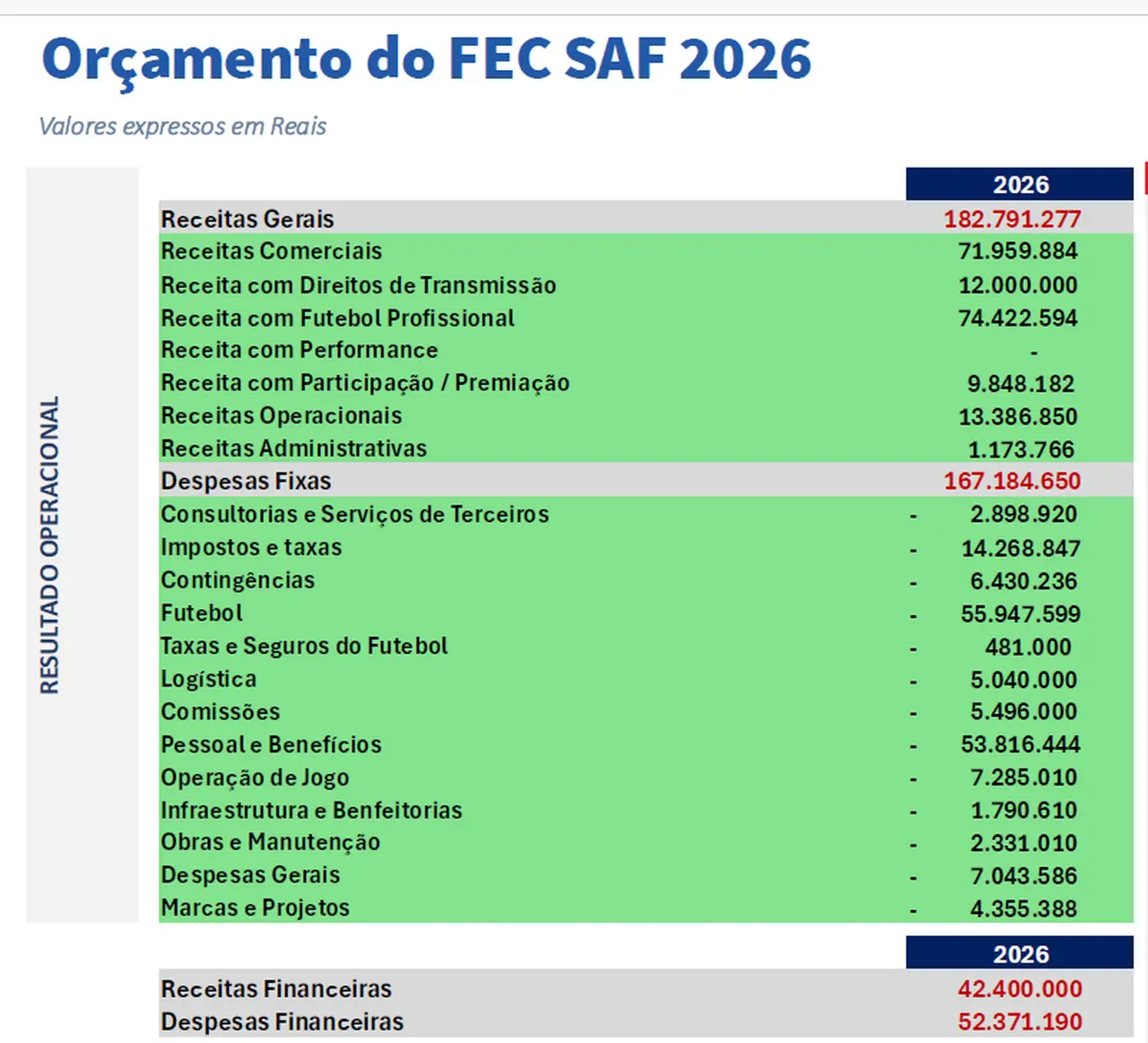 O valor estipulado para a contratação de jogadores em 2026 é de R$ 15 milhões (R$ 10 milhões para contratações nas janelas de 2026 e R$ 5 milhões para pagamento de obrigações já contratadas).