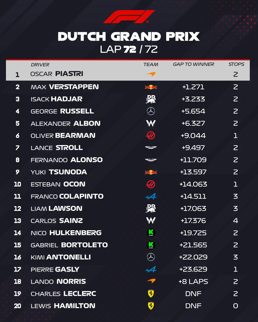 Largando da pole position, Piastri liderou do início ao fim uma corrida na qual Verstappen ultrapassou Norris na primeira curva, mas não acompanhou o ritmo da McLaren do australiano, apesar do apoio da torcida holandesa nas arquibancadas.