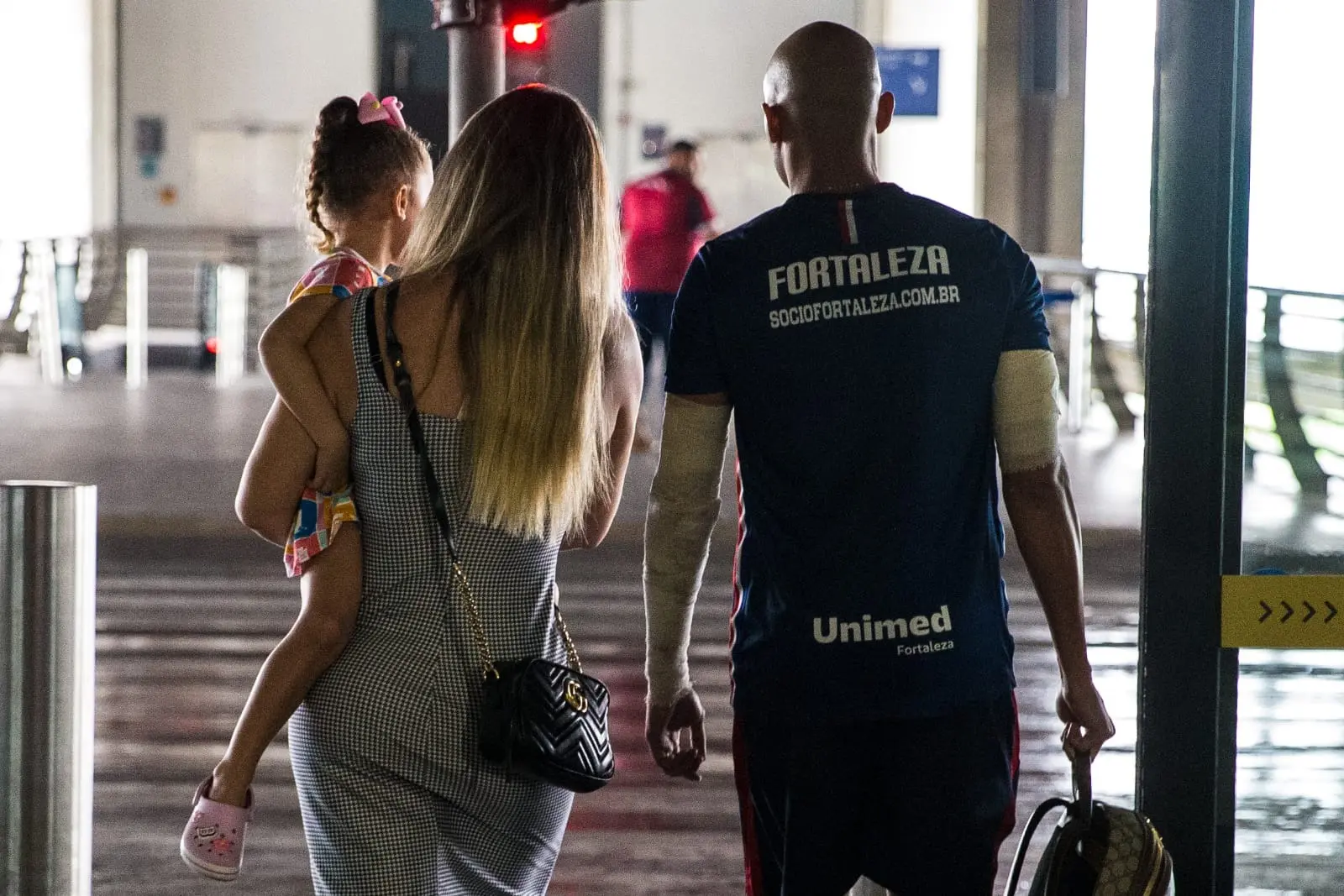 O jogador Dudu foi um dos feridos na ação da torcida do Sport. Com estilhaços de vidro pelo corpo, o atleta desembarcou enfaixado nos braço e na perna. Dudu foi recepcionado pela esposa Carol e pela sua filha, Bella, de três anos. Quando viu o pai, a pequena questionou sobre os ferimentos.