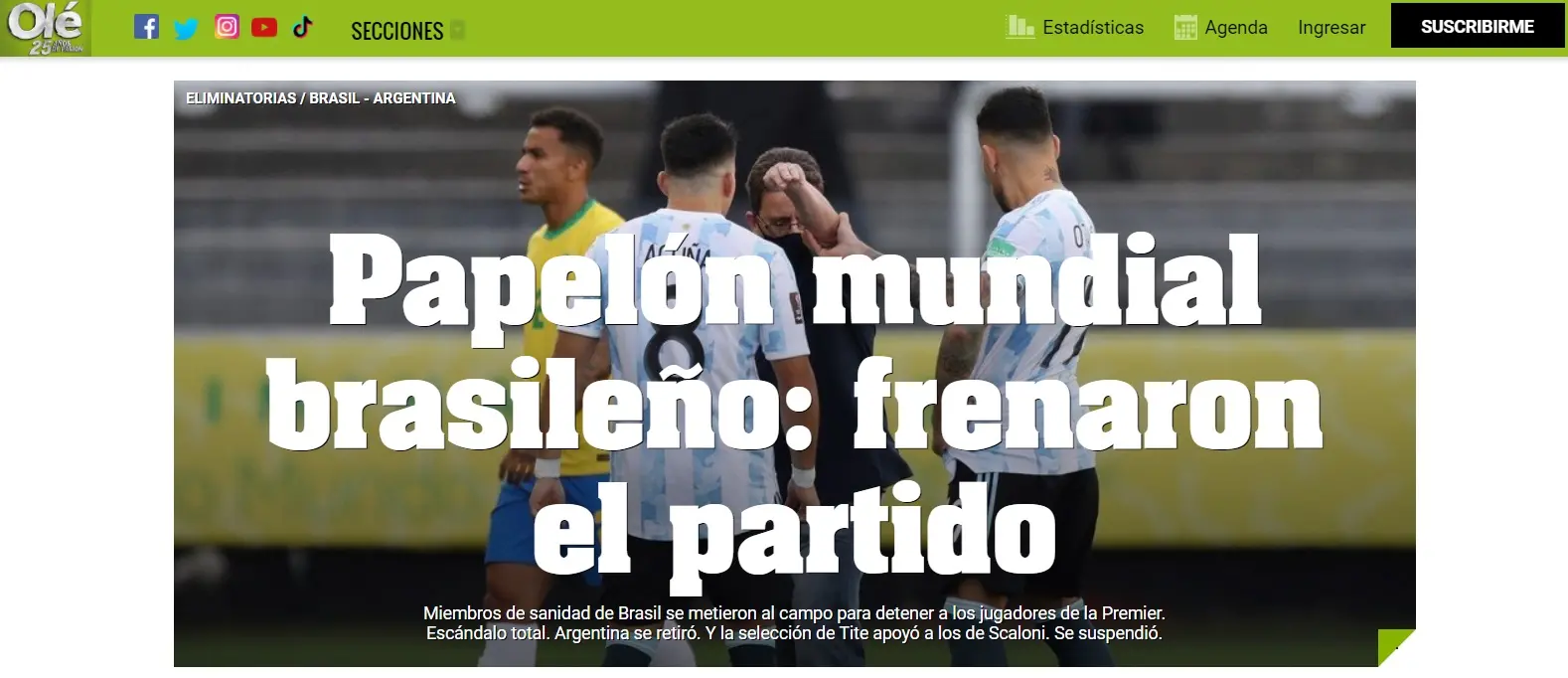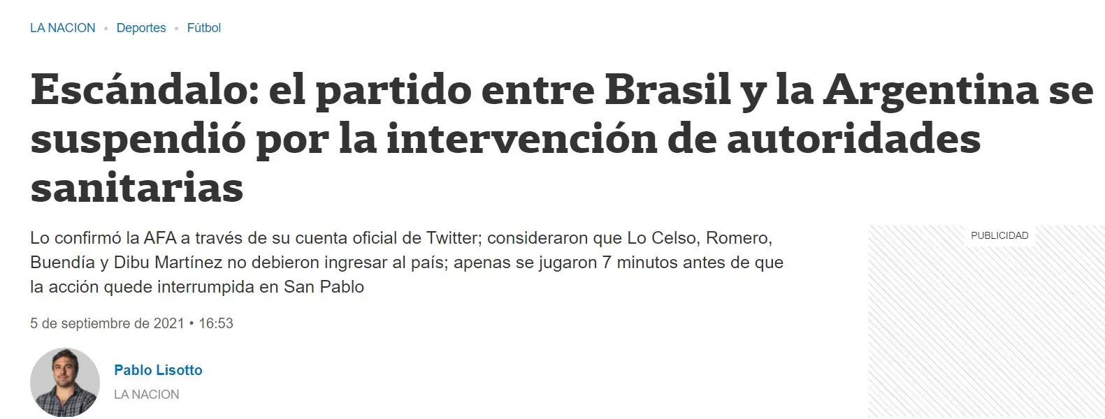 Os jornais argentinos repercutiram o cancelamento do jogo entre Brasil e Argentina pelas Eliminatórias da Copa do Mundo de 2022. O foco das críticas foi a atuação da Agência Nacional de Vigilância Sanitária (Anvisa) e não a Asociación del Fútbol Argentino (AFA) ou os jogadores que omitiram informações imigratórias.