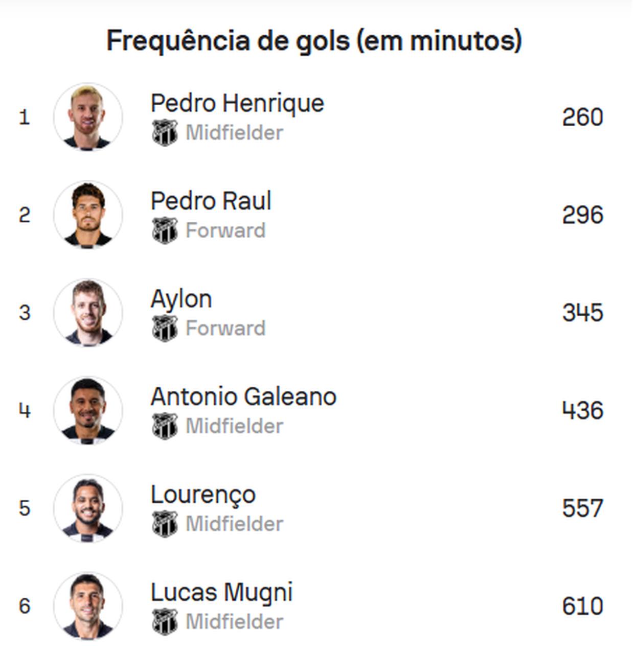 O atacante Pedro Henrique é o jogador do Ceará que precisa de menos minutos para marcar gols na Série A. Com 4 gols em 19 jogos, ou 1.012 minutos, ele tem mostrando ser o mais 'eficiente'. Pedro Henrique precisa de 260 minutos para marcar um gol.