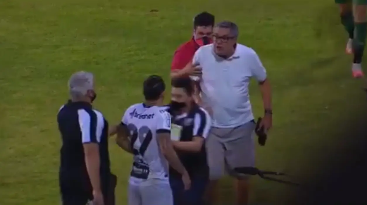 "Aqui você apanha. Está pensando o quê? Aqui você apanha. Seu vagabundo! Te meto a porrada", gritou Paulo Carneiro, que invadiu o campo para reclamar com o árbitro.