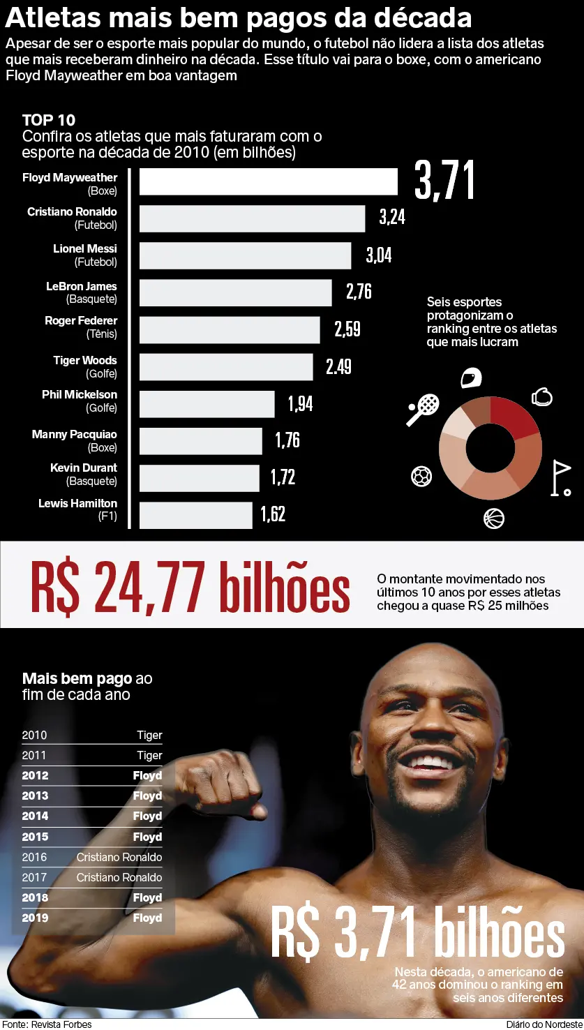 No total, esses 10 atletas de seis esportes diferentes movimentaram um montante de R$ 24,77 bilhões nesta década. O pugilista Floyd Mayweather liderou a lista de mais bem pago do ano em 6 oportunidades (2012-2015, 2018 e 2019), enquanto Tiger Woods (2010 e 2011) e C. Ronaldo (2013 e 2014) tiveram o privilégio somente 2 vezes cada.