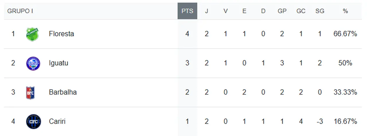 O Floresta lidera o quadrangular com 4 pontos, o Iguatu vem em seguida com 3 pontos, depois Barbalha (2) e Cariri (1).
