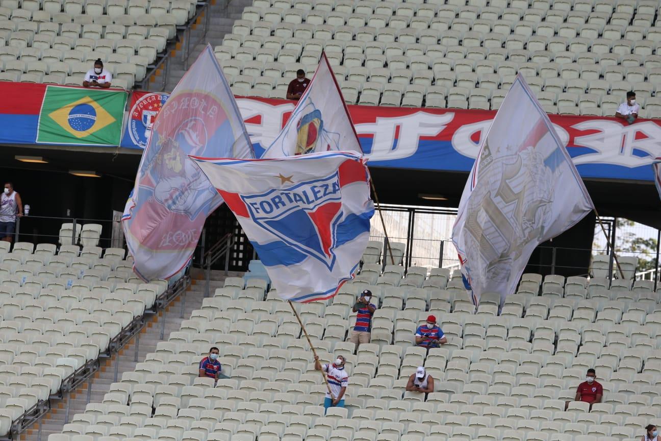 A atmosfera da Arena Castelão é renovada com a torcida. Apesar do baixo número de presentes, o som ecoou no estádio e transmitiu a sensação de mais torcedores. Esses, espalhados por todos os lados do equipamento - em cada setor, as cores vermelho, azul e branco foram preenchidas.