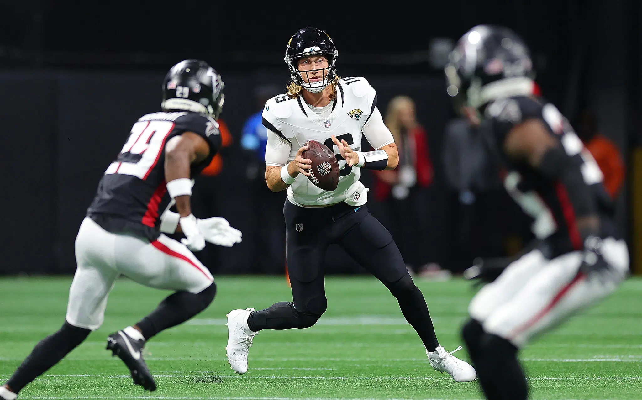 Trevor Lawrence, jogador do Jacksonville Jaguars, durante jogo contra o Atlanta Falcons, pela pré-temporada da NFL 2024/25