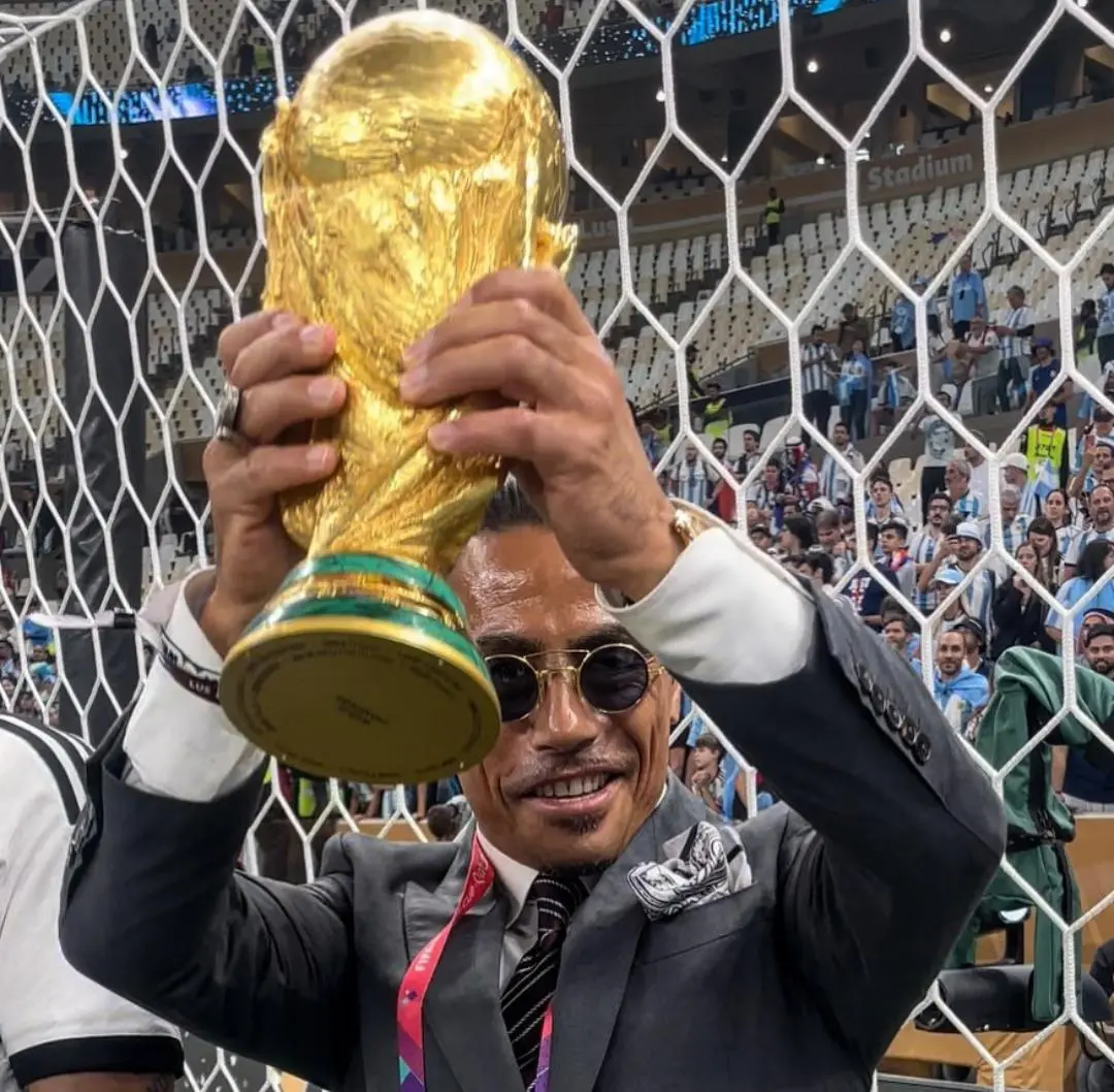 'Salt Bae' virou sensação entre jogadores na Copa do Mundo por servir bife folheado a ouro. O chef tem um restaurante em Doha. Ele tem recebido diversas críticas por acessar o campo logo após o título da Argentina, principalmente por tocar a taça da Copa do Mundo, algo exclusivo apenas aos campeões e chefes de estado.