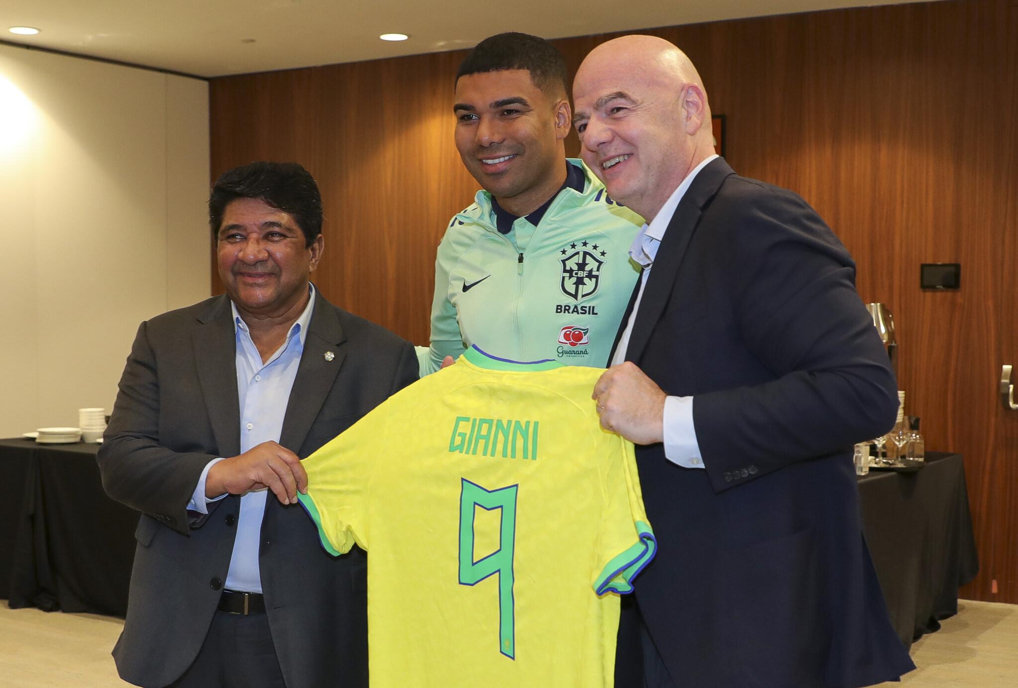 De acordo com a CBF, Infantino também teve uma conversa reservada com Ednaldo por cerca de meia hora. Antes disso, ele conversou com jogadores da seleção e bateu foto com uma camisa da Seleção Brasileira, com seu nome nas costas. O presente foi dado pelo capitão da equipe, o volante Casemiro.