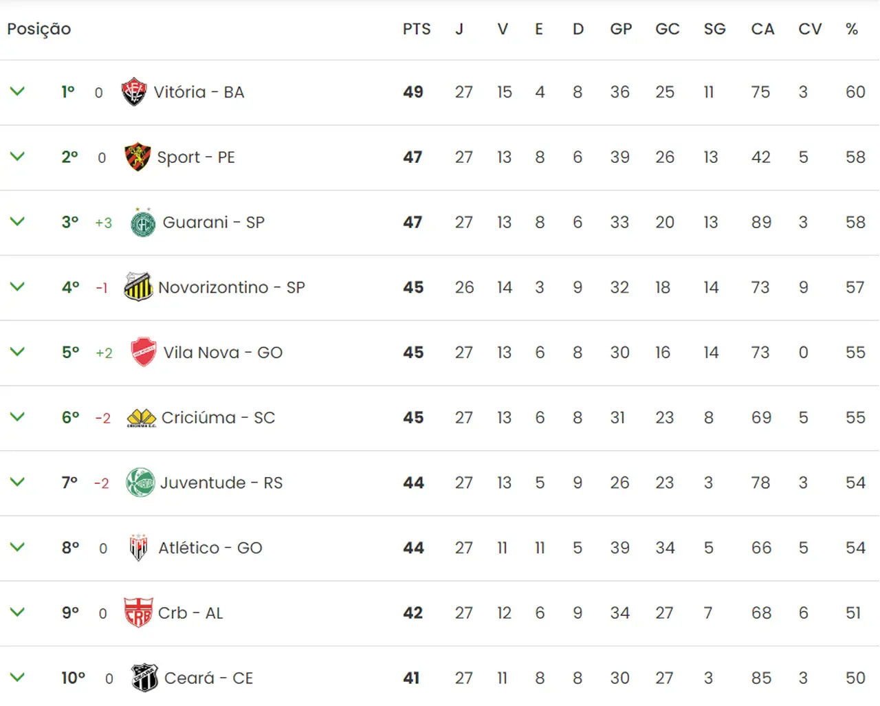 Entre o líder e o Vovô, estão outros 8 times, todos muito próximos na pontuação: Sport (47), Guarani (47), Novorizontino (45), Vila Nova (45), Criciúma (45), Juventude (44), Atlético-GO (44) e CRB (42).