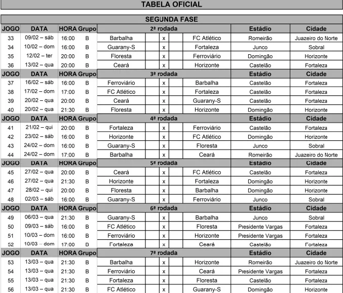 A Federação Cearense de Futebol divulgou nesta segunda-feira (04) a tabela completa e detalhada da 2ª fase do Cearense. De acordo com o documento, a segunda rodada da segunda fase do Cearense começa no próximo fim de semana. Os jogos serão os seguintes: Barbalha x FC Atlético, no sábado (9), no Romeirão, em Juazeiro; Guarany-S x Fortaleza, no domingo (10), no Junco, em Sobral; Floresta x Ferroviário, na terça-feira (12), no Domingão, em Horizonte; e Ceará x Horizonte, na quarta-feira (13), no Castelão.