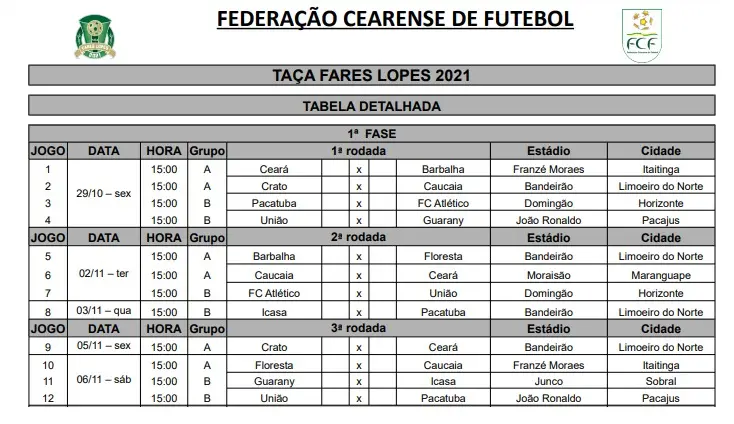 A Federação Cearense de Futebol (FCF), divulgou a tabela da Taça Fares Lopes 2021. São 10 clubes na disputa, divididos em dois grupos. O grupo A tem Ceará, Barbalha, Caucaia, Floresta e Crato, enquanto o B tem Atlético, Icasa, Pacatuba, Guarany e União.Os dois melhores de cada avançam para a semifinal, em jogos de ida e volta. O campeão garante vaga na Copa do Brasil 2022.