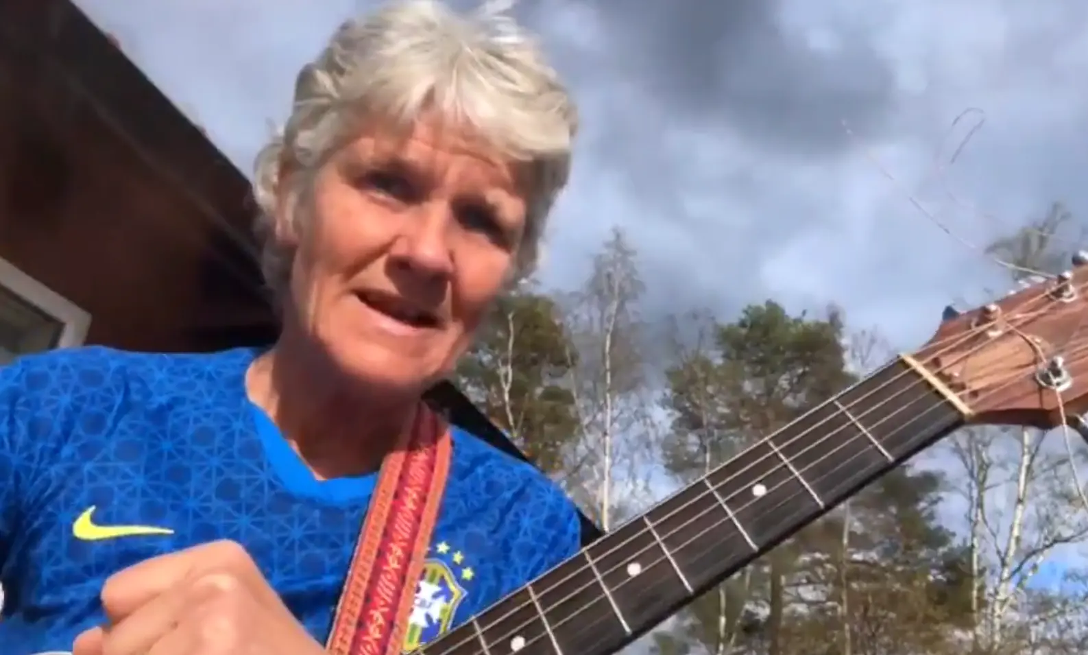 Pia Sundhage toca violão e canta a música trocando o trecho "tu vens" por "set piece", expressão em inglês para jogadas ensaiadas com bola parada