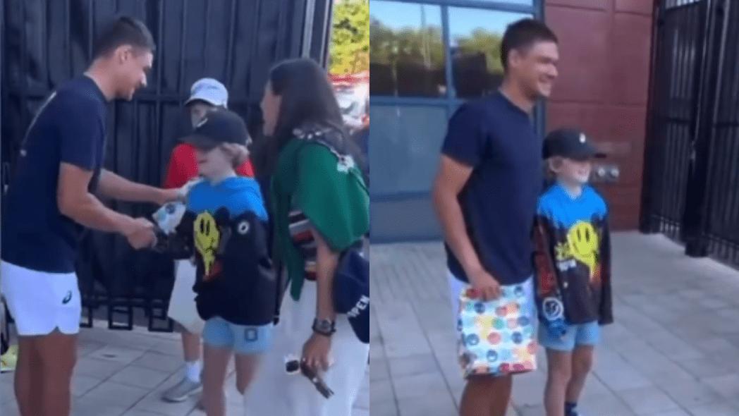Kamil Majchrzak meeting the young boy who had the hat taken from him the other day at the US Open.