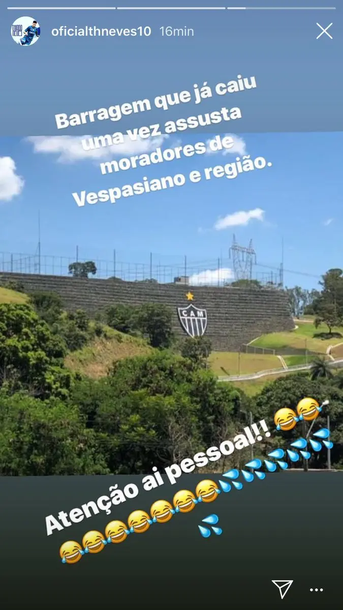 "Barragem que já caiu uma vez assusta moradores de Vespiano e região", escreveu o jogador em foto de parede com símbolo do Atlético/MG, no CT do clube, fazendo alusão ao rebaixamento do Galo à Série B do Brasileirão em 2005.