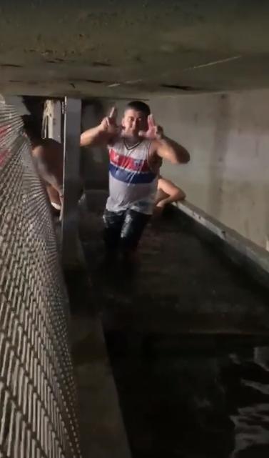 Um vídeo publicado nas redes sociais mostra a cena dois rapazes no local cheio de água da chuva. Um sentado e outro em pé. Um deles grita: “Bora, Leão!”