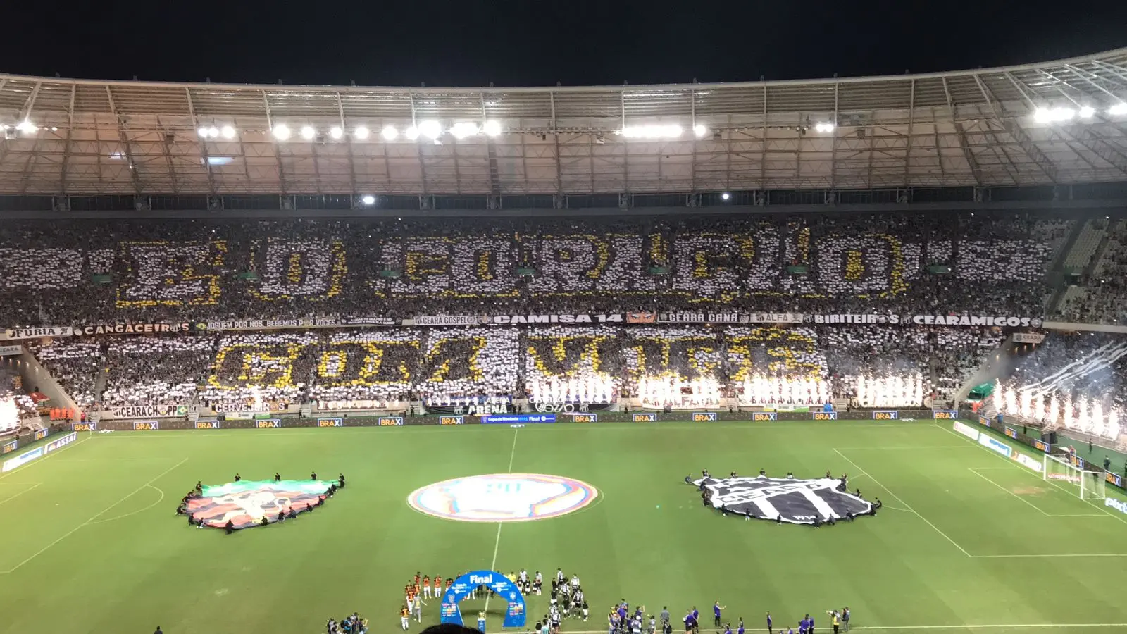 Torcida do Ceará exibe agora um mosaico permanente. Torcedores estão vestidos com capas pretas e brancas. pic.twitter.com/nE9ftyu91I