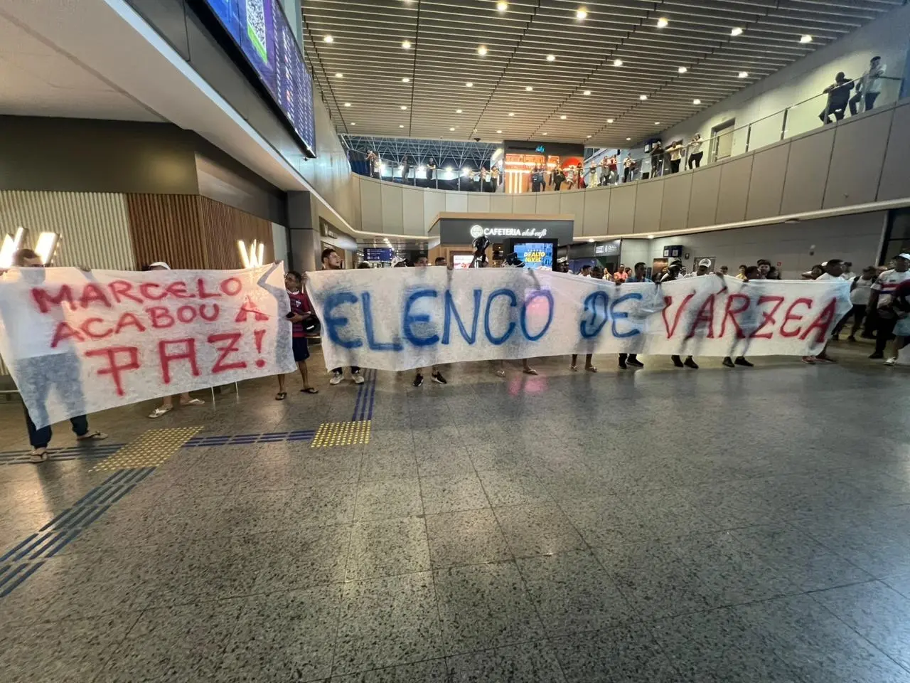 No protesto, os torcedores exibiram faixas: 'Elenco de várzea' e 'Marcelo acabou a Paz'. A torcida também cantou 'time sem vergonha' e 'pra jogar no Leão tem que ter disposição'.