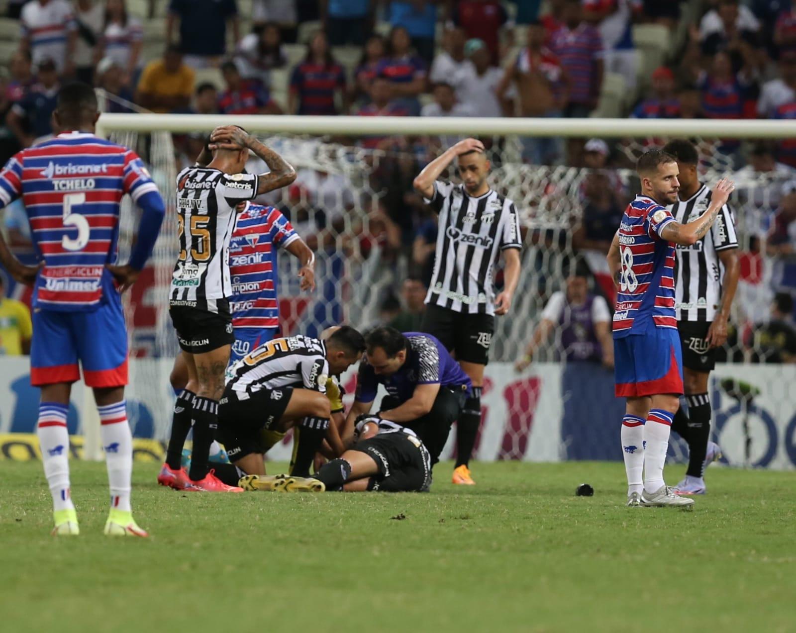 Em nota, a assessoria do Ceará informou que o jogador teve um trauma na cabeça, que provocou uma concussão - perda transitória de consciência. O atleta foi atendido pelo Dr. Joaquim Garcia e está consciente. Seguindo protocolo, ele foi encaminhado para o Hospital Regional da Unimed e vai realizar examaes de imagem.