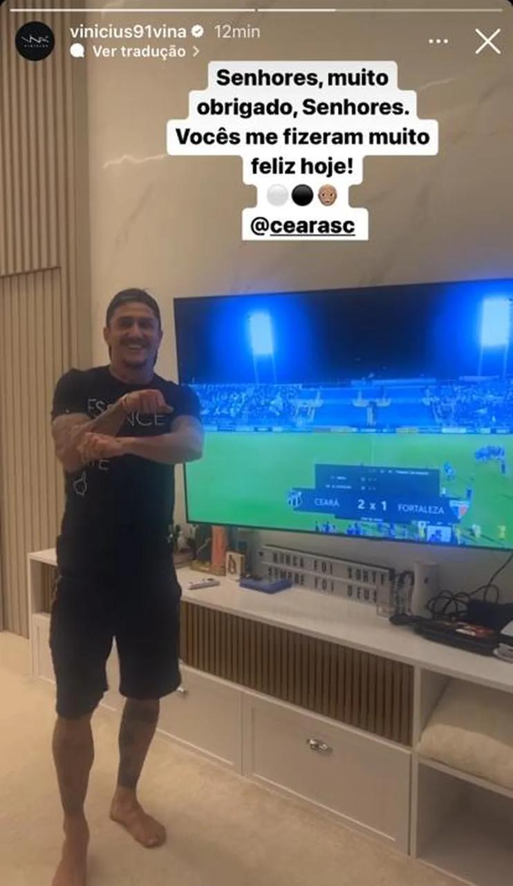 O meia Vina comemorou a vitória do Ceará no Clássico-Rei, nesta terça-feira (7), no estádio Presidente Vargas (PV), pelo Estadual. Fora do jogo, o atleta do Vovô utilizou as redes sociais para reproduzir a comemoração do atacante Thiago Galhardo, do Fortaleza, e festejar.