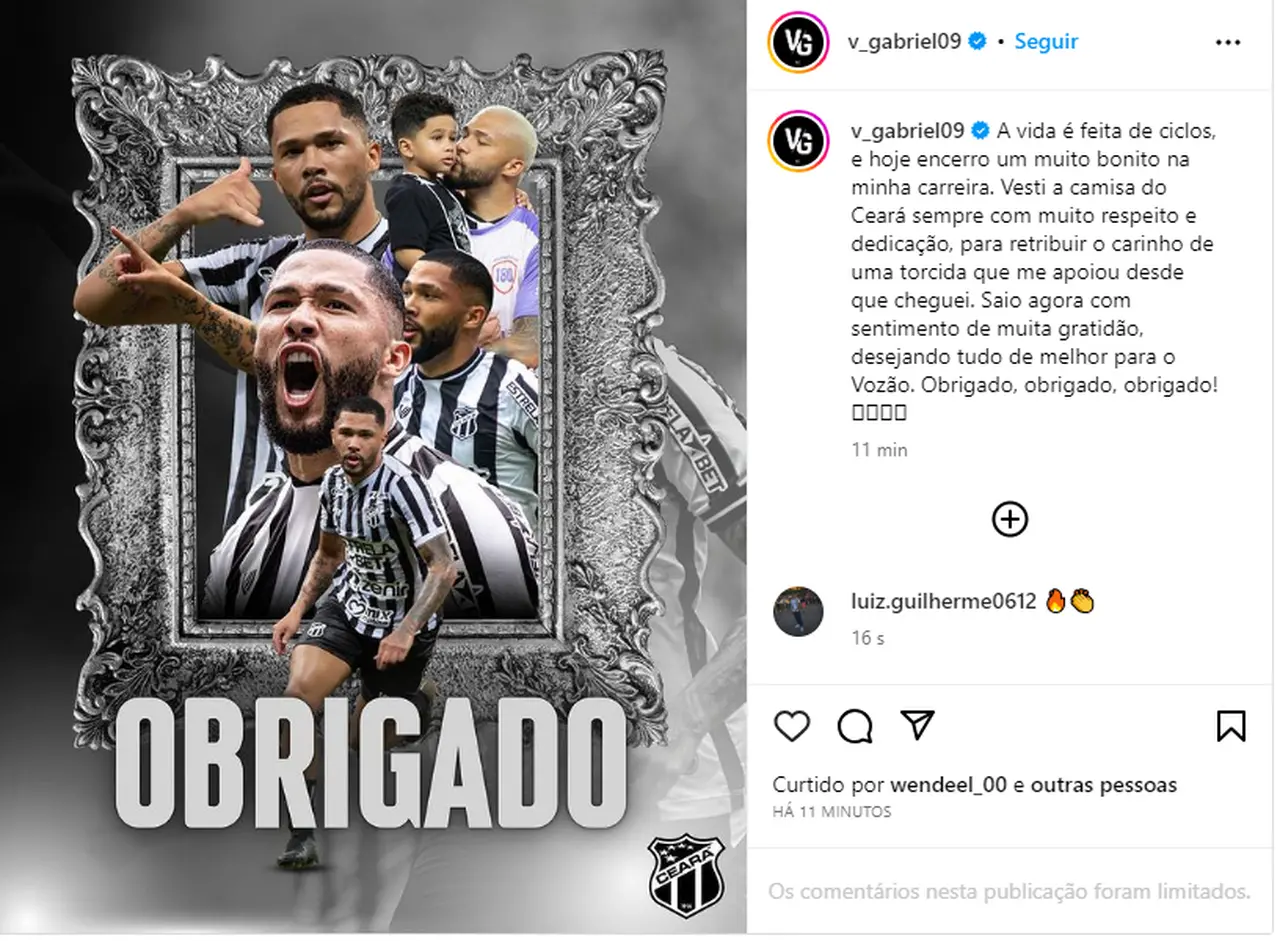 O atacante Vitor Gabriel se despediu do Ceará nesta terça-feira (4). O jogador fez uma publicação em suas redes sociais, destacando o período em que jogou no clube e agradeceu ao Ceará e sua torcida.