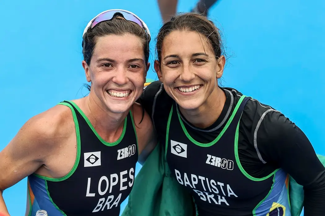 A cearense Vittoria Lopes e a paulista Luisa Baptista ao fim da prova de triatlo nas Olimpíadas