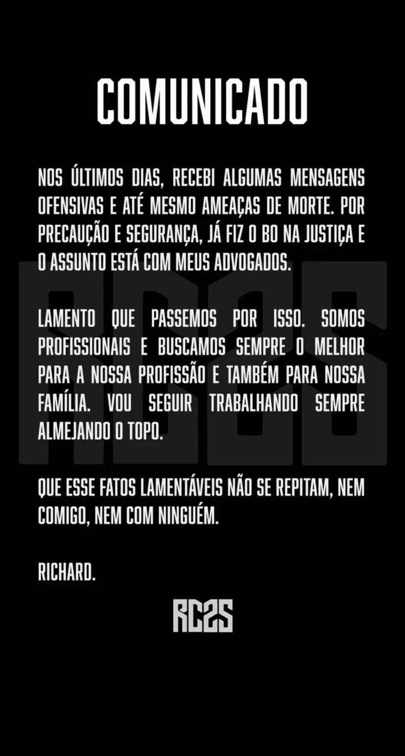Após isso, Richard fez um post em sua rede social, reforçando que fez o B.O na justiça e que o assunto já está com os advogados dele.