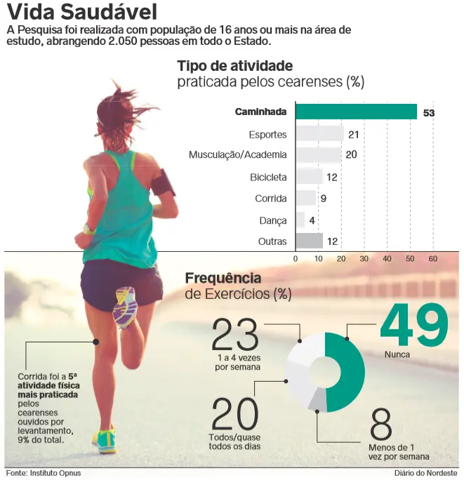 O despertar para uma vida saudável do servidor público José Frederico Aquino, 58, veio com o resultado de exames de sangue, que apontaram taxas elevadas de colesterol. Hoje, passados cerca de 12 anos de dedicação às corridas de rua, o então maratonista faz parte dos 20% da população cearense que praticam exercícios físicos todos ou quase todos os dias. O dado integra a pesquisa "Saúde, Alimentação e Atividades Físicas", feita pelo Instituto Opnus e divulgada com exclusividade pelo Sistema Verdes Mares.