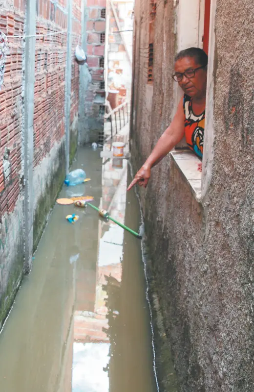 Na prática, ter o imóvel ligado ao sistema de coleta e tratamento de esgoto não é sinônimo de saneamento pleno - na casa da aposentada Inácia Tavares, 72, no bairro Cais do Porto, ocorre justamente o contrário. Periodicamente, a água contaminada por fezes e urina retorna do bueiro da Cagece, na rua, para dentro da residência, tornando o odor e a presença de insetos e larvas (popularmente chamadas de "tapurus") insuportáveis. "A gente paga uma taxa cara, quase o dobro do preço da água, e precisa dormir com esse cheiro podre. Já moro aqui há mais de 30 anos e esse problema sempre existiu, mas agora tá muito mais grave", indigna-se Inácia, que precisou se mudar temporariamente para a casa da mãe.