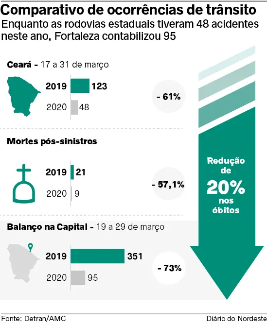 Os registros de óbitos por acidentes também acompanharam o cenário de quedas. Em igual intervalo de tempo, as mortes decresceram de 21 para 9. Os dados foram encaminhados pelo Departamento Estadual de Trânsito (Detran-CE), após solicitação do Sistema Verdes Mares. O órgão, no entanto, não detalhou em quais municípios e rodovias estaduais as ocorrências foram registradas.