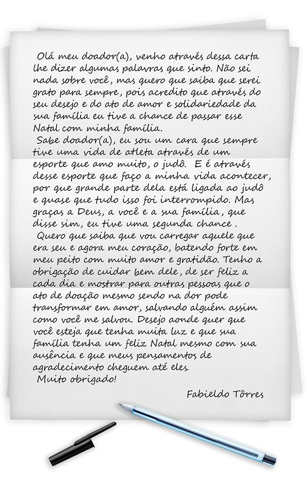 A transformação da dor em amor também é expressada nas palavras escritas pelo profissional de educação física Fabieldo Tôrres,39, para aquele, ou aquela, que o doou um dos órgãos mais vitais ao corpo: o coração. Apesar de não saber nada sobre essa pessoa, será grato para sempre pela chance de poder passar mais um Natal com a família, segundo diz a carta.