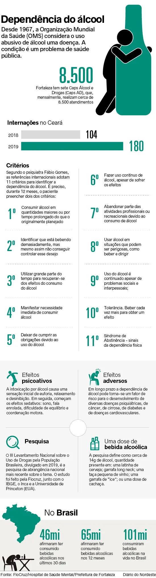 A dependência do álcool é uma doença crônica que ainda enfrenta gargalos culturais e sociais para ser tratada. No Ceará, em 2019, o Hospital de Saúde mental internou 180 pacientes em decorrência do uso abusivo da substância