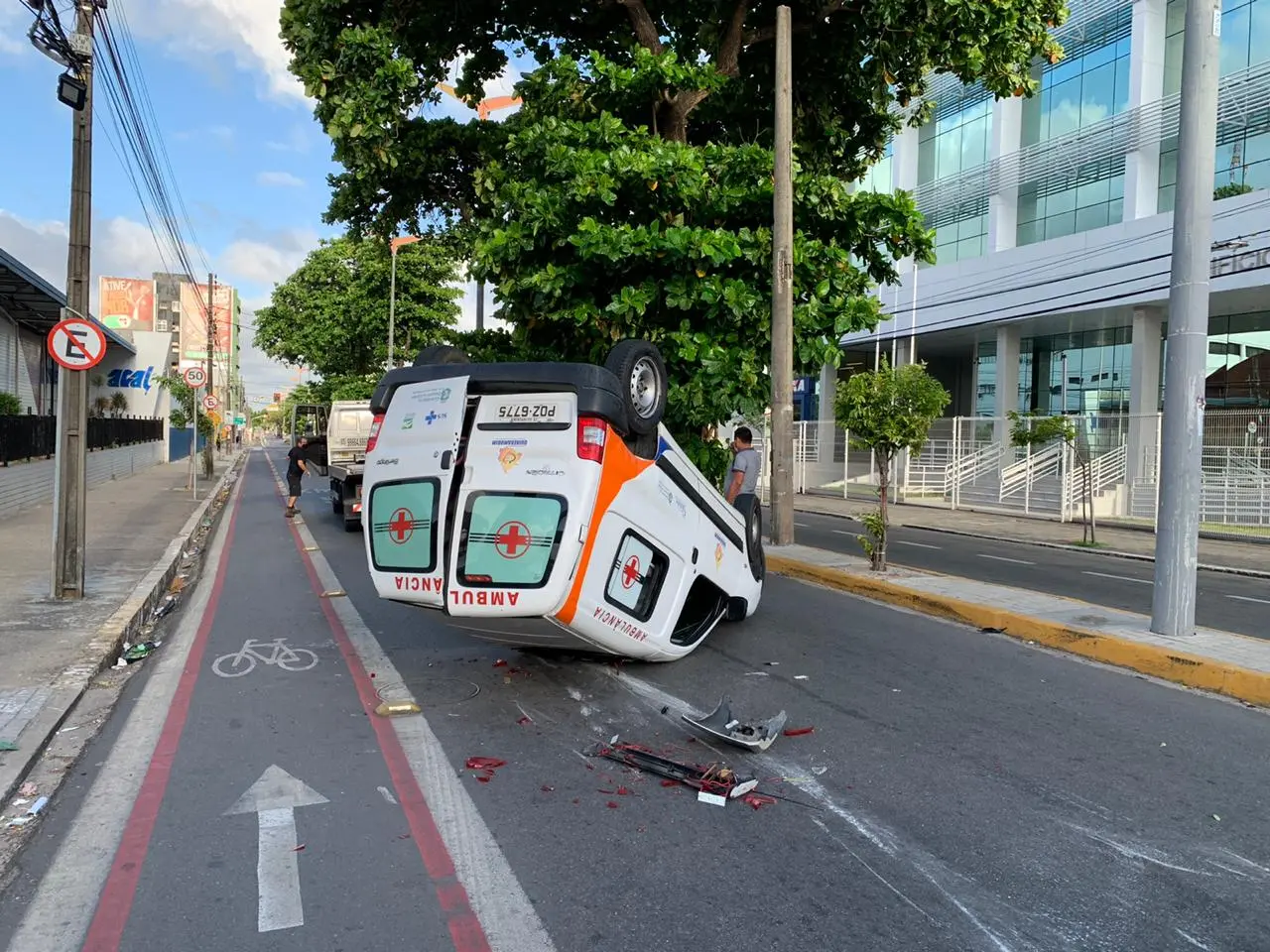 Uma ambulância da cidade de Quixeramobim capotou no cruzamento das avenidas Duque de Caxias e Tristão Gonçalves, no Centro de Fortaleza, na madrugada desta segunda-feira (9), após colidir com um carro de viagens por aplicativo.