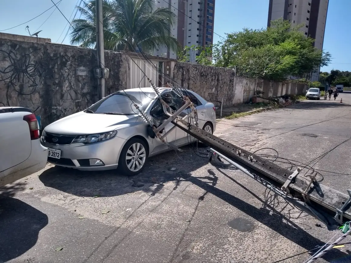 Um carro estacionado foi atingido por um poste na Rua Doutor José Frota, Bairro Mucuripe, em Fortaleza, por volta de 9h desta terça-feira (2). Ninguém ficou ferido. Segundo moradores da região, o poste foi derrubado após um andaime cair sobre a fiação elétrica e arrastar o equipamento.