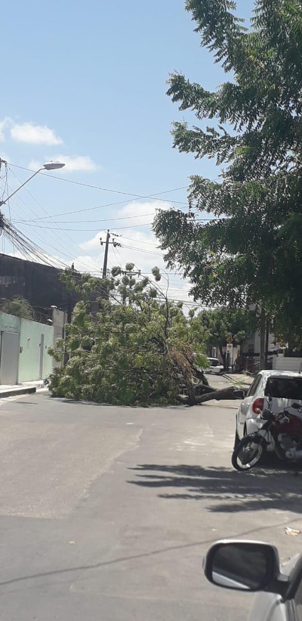 Árvore cai e bloqueia passagem de veículos na Rua Sergipe, no Demócrito Rocha