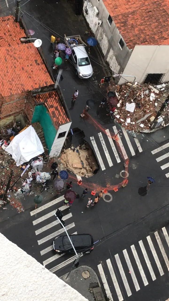 "A rua fica um pouco alagada, mas isso nunca tinha acontecido", relatou. Ainda de acordo com a moradora, o buraco continua aumentando e oferecendo risco a uma casa na esquina com a Rua Júlio Azevedo. Ela informou também que a área próxima à cratera foi isolada pelos próprios moradores.