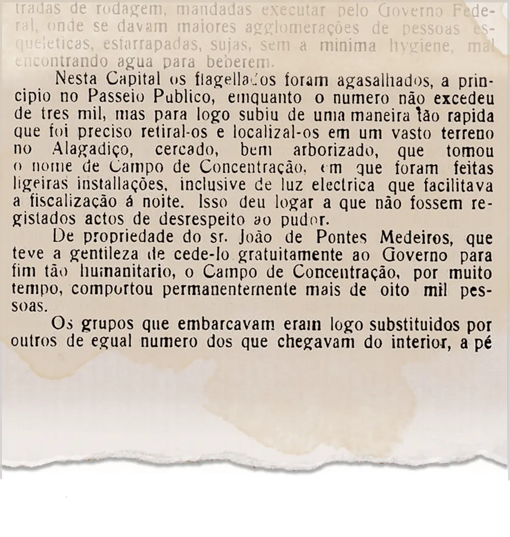 “Os campos tinham uma função prática de controlar a população pobre, os flagelados, como eram chamados na época, as pessoas que vinham do interior para Fortaleza atrás de auxílio. As pessoas eram colocadas nesses campos, separados homens e mulheres”.